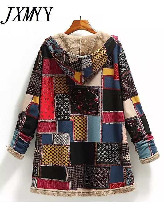 Winter Vintage Women Coat Warm Printing Thick Fleece Hooded Long Jacket with Pocket Ladies
