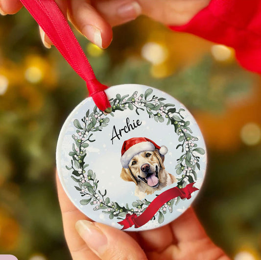 Personalized Pet Floral Wreath Embroidery Ornament | Custom Dog Portrait Hoop | Christmas Tree Decoration