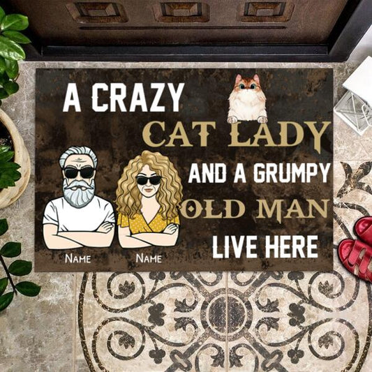 A Crazy Cat Lady And A Grumpy Old Man Live Here Personalized Doormat - Man, Woman and Cats can be customized