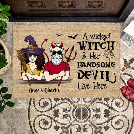 Wicked Witch And Handsome Devil Live Here Halloween Personalized Doormat - Man, Woman, Name can be customized