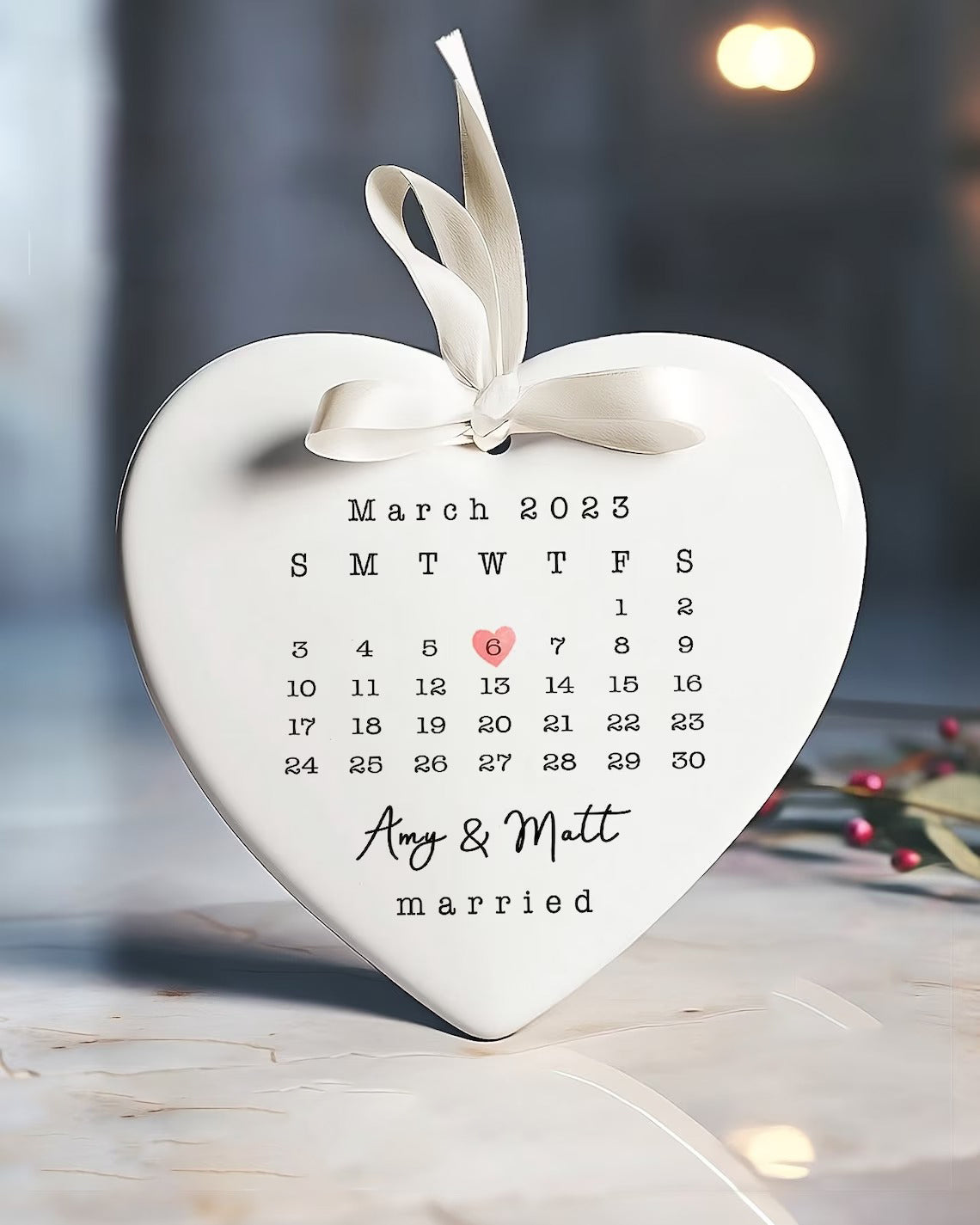 Married Ornament, Wedding Gift, Wedding Date ornament, Heart Calendar, Anniversary Gift, Our First Christmas, Newlywed Gift, Engagement Gift