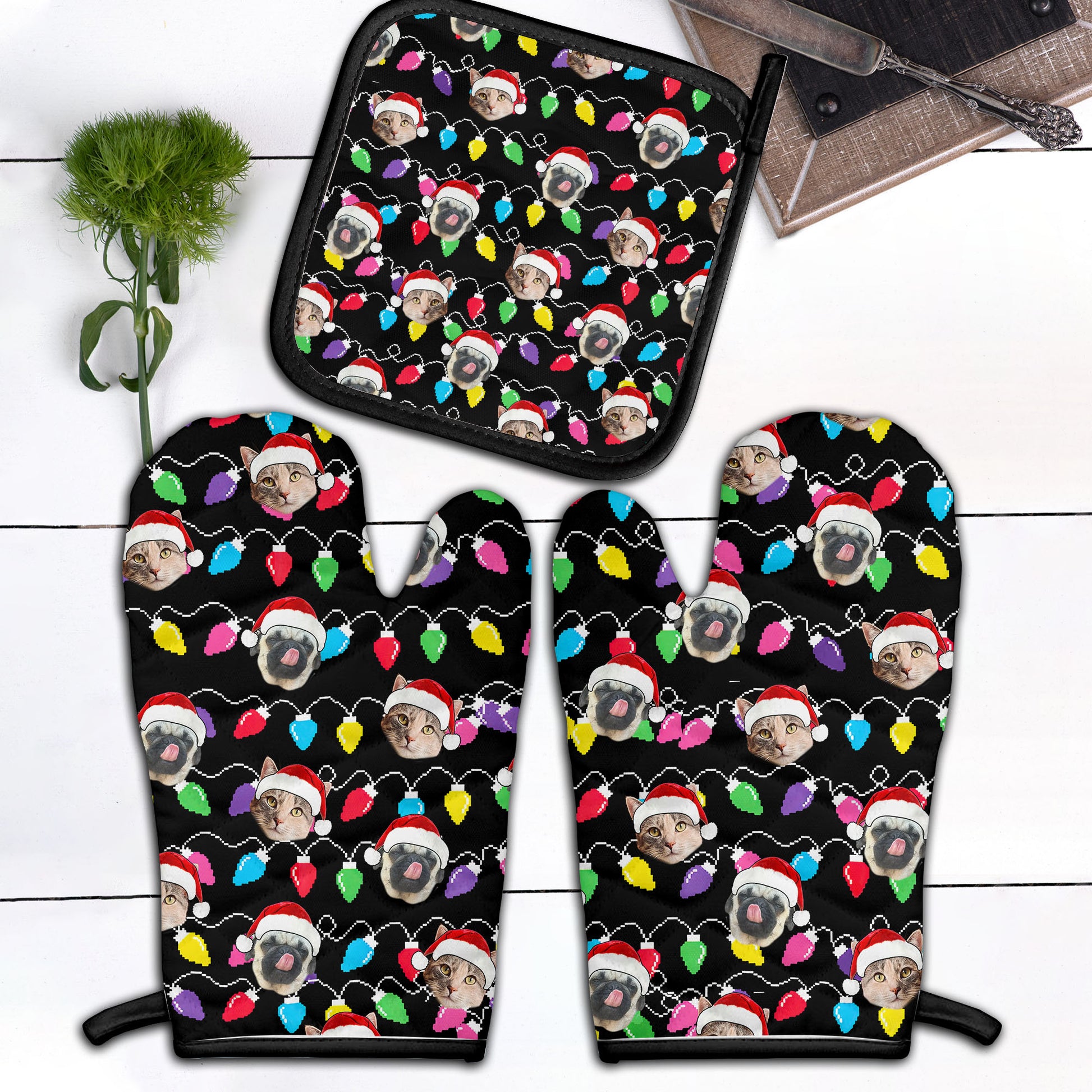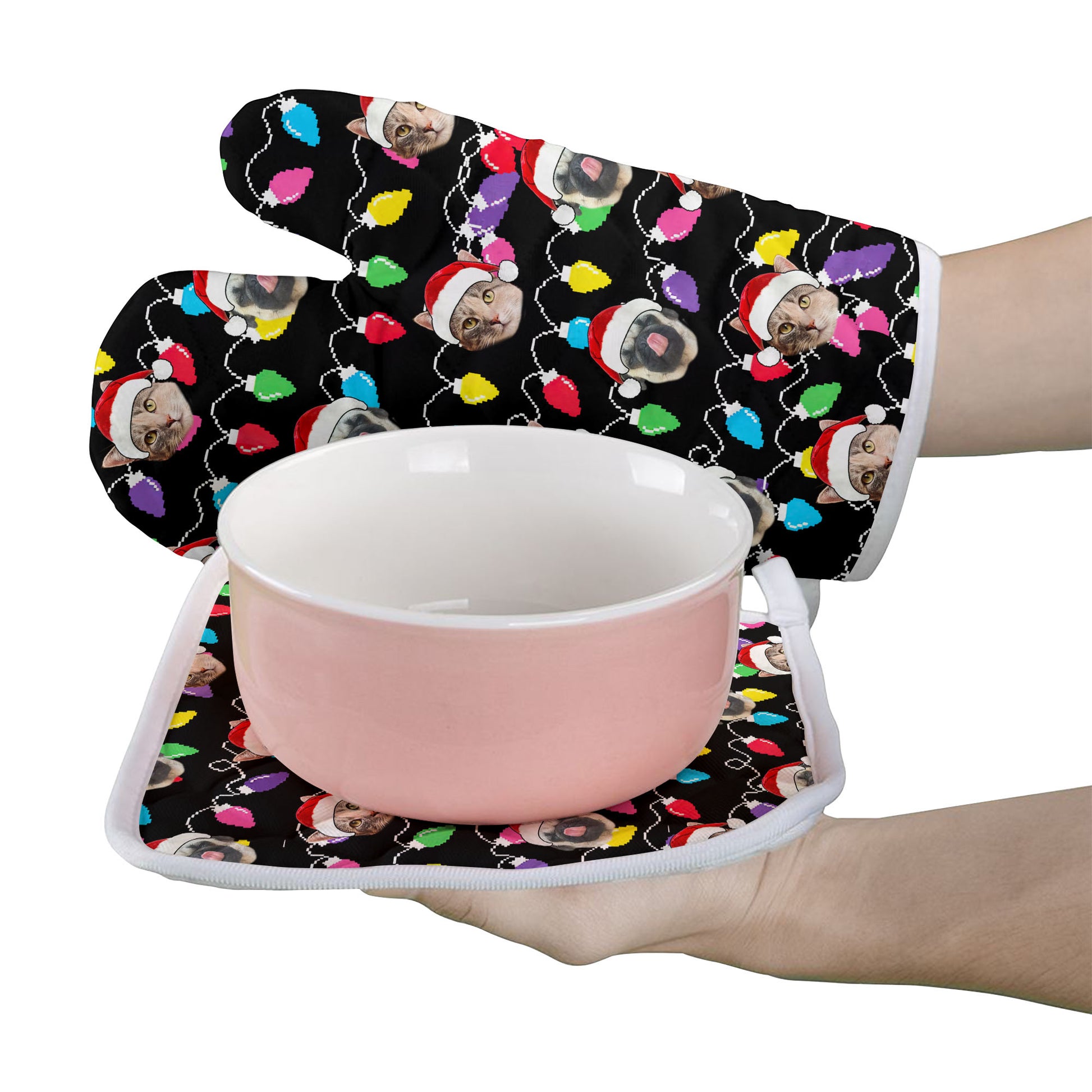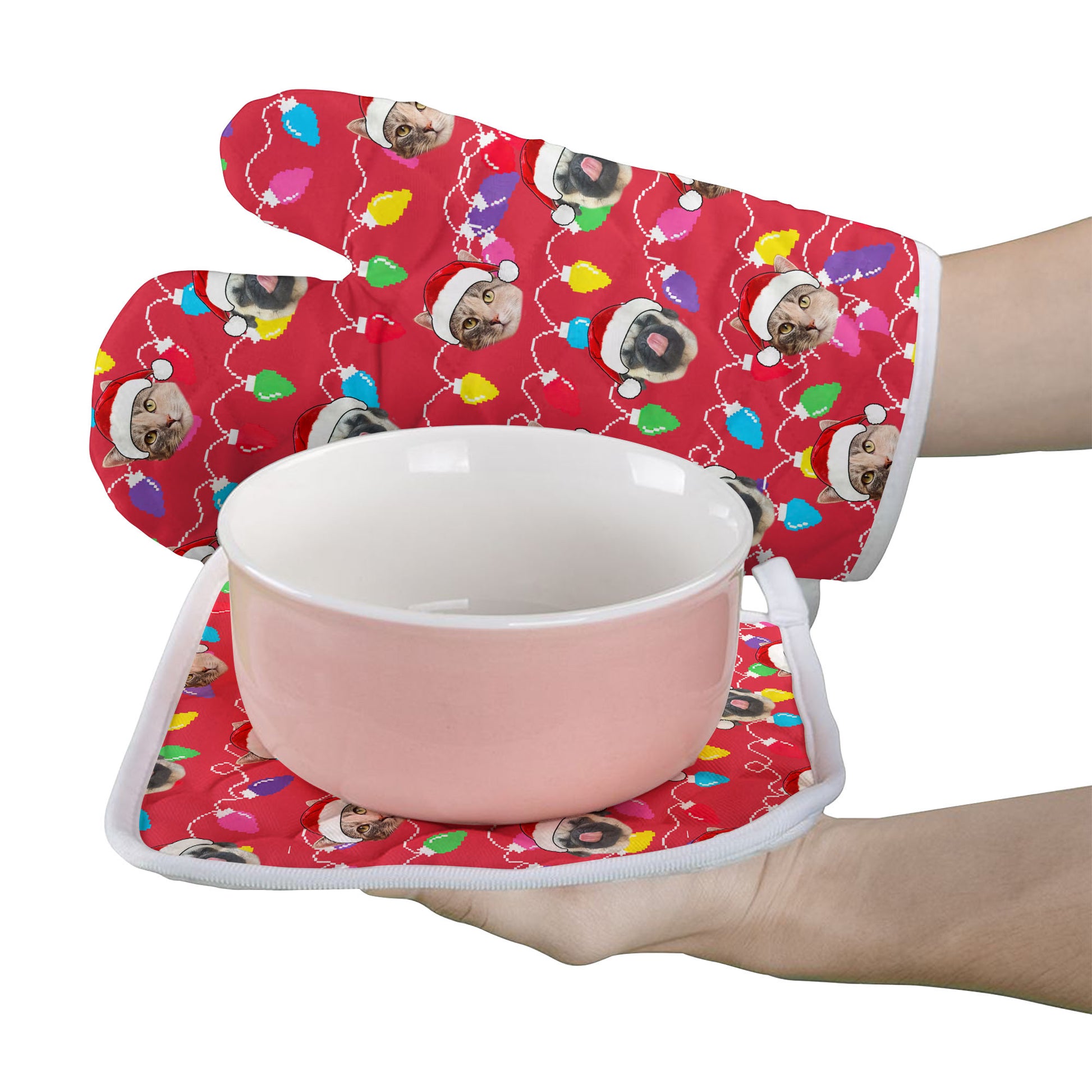Personalized Pet Dog Cat Christmas Light Apron Oven mitt And Pot Holder Set