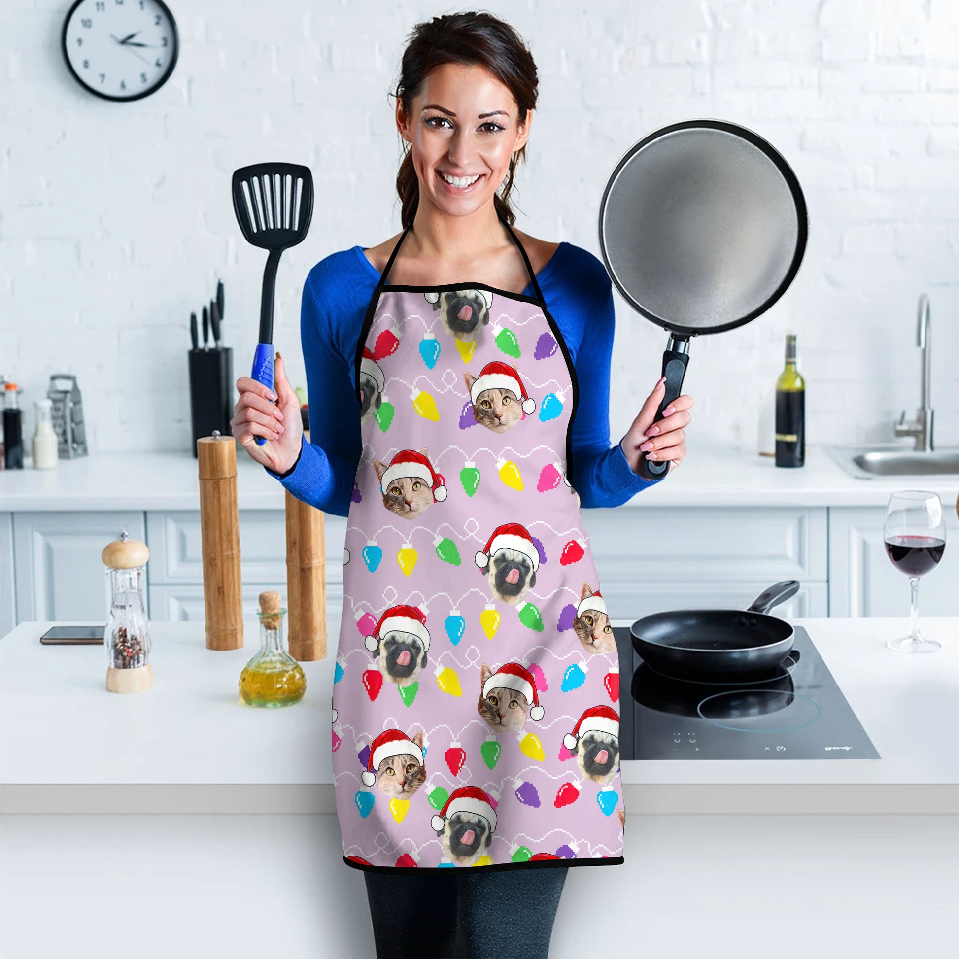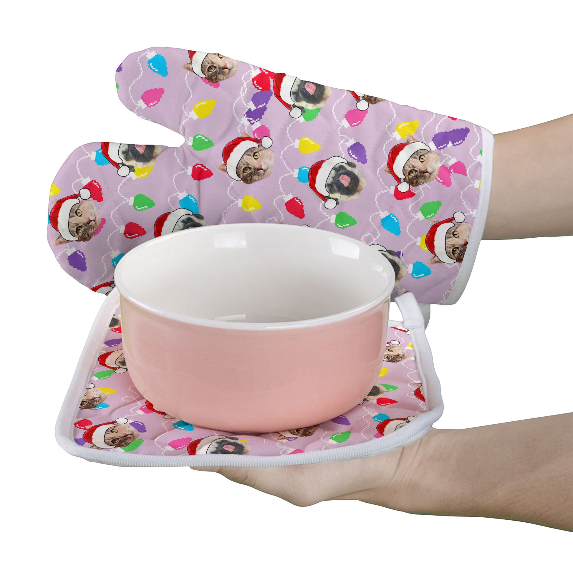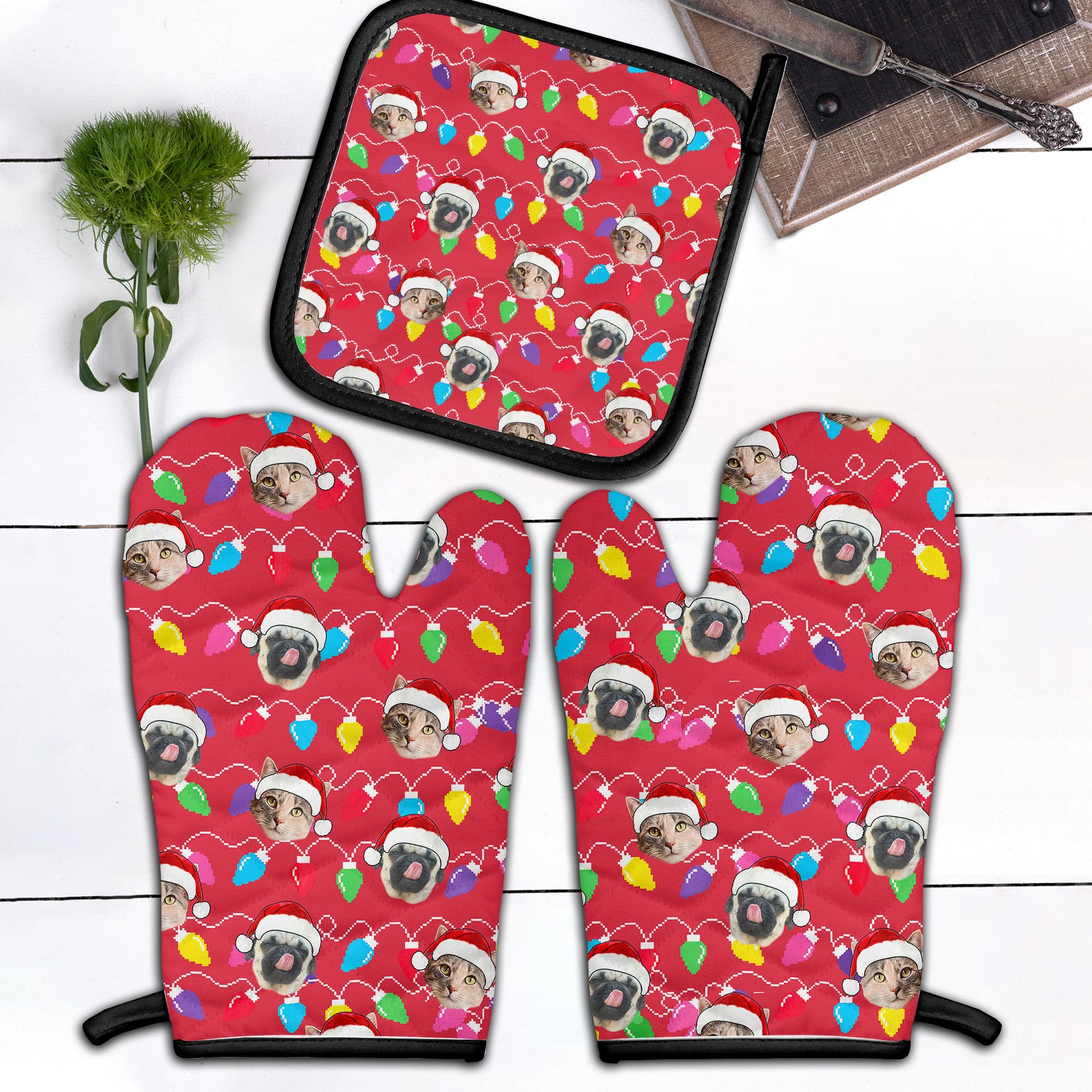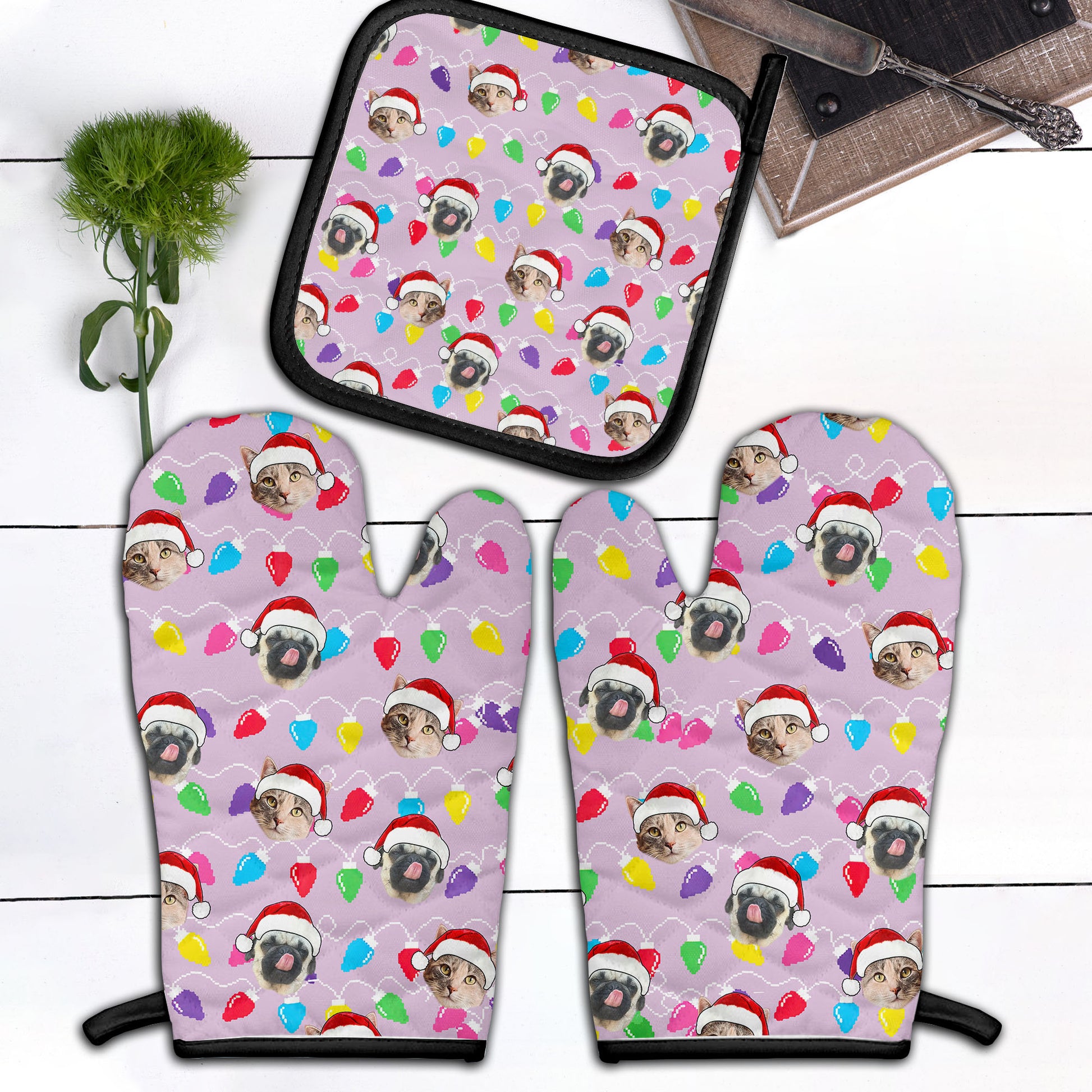 Personalized Pet Dog Cat Christmas Light Apron Oven mitt And Pot Holder Set